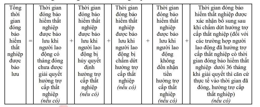 Thời gian đóng bảo hiểm thất nghiệp được bảo lưu | = | Tổng thời gian đóng bảo hiểm thất nghiệp | - | Thời gian đóng bảo hiểm thất nghiệp đã hưởng trợ cấp thất nghiệp |