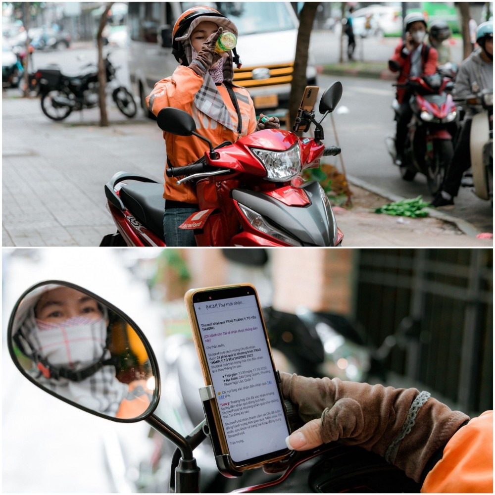 | Giờ đây, nữ shipper đã có “đầy mình kinh nghiệm” khi luôn chủ động nhắn tin trước cho khách để xin thêm thời gian nếu quán ăn chuẩn bị món hơi lâu. Chị cũng không quên nhắc về các đồng nghiệp thân thiện đã hỗ trợ mình lúc còn là “lính mới”. |