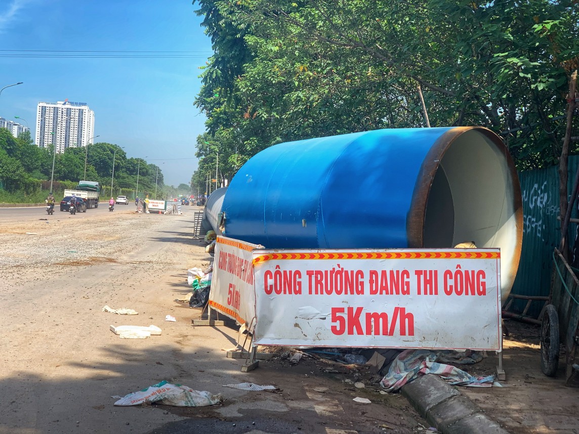 | Một ống thép dẫn nước nặng hàng tấn, gắn biển báo sơ sài, được tập kết ngay trên vỉa hè gần với công trình tại Đại lộ Thăng Long. |