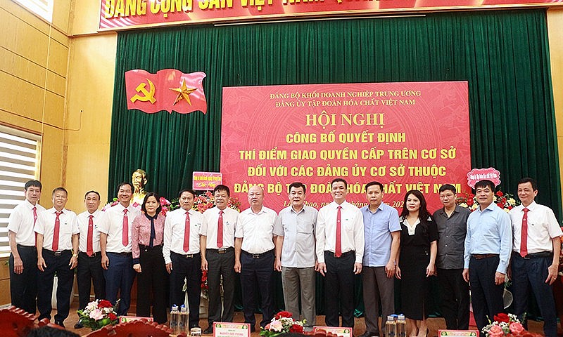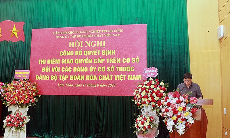 Cụ thể, ngày 15/8/2023, tại Công ty CP Supe Phốt phát và Hóa chất Lâm Thao, Đảng ủy Khối Doanh nghiệp Trung ương tổ chức hội nghị công bố quyết định thí điểm giao quyền cấp trên cơ sở đối với 03 đảng bộ cơ sở trực thuộc Đảng bộ Tập đoàn Hóa chất Việt Nam, gồm: Đảng bộ Công ty TNHH MTV Apatit Việt Nam; Đảng bộ Công ty CP Supe phốt phát và Hóa chất Lâm Thao; Đảng bộ Công ty CP Phân đạm và Hóa chất Hà Bắc.