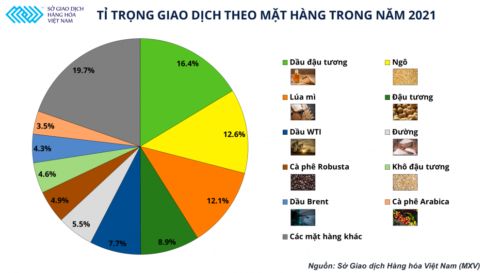 Tính đến ngày 31/12/2021, MXV đang niêm yết giao dịch 31 mặt hàng, chia thành 4 nhóm: Nông sản, Năng lượng, Nguyên liệu công nghiệp và Kim loại. Dầu đậu tương vẫn tiếp tục là mặt hàng có tỉ trọng giao dịch lớn nhất trong năm 2021, đạt 16,4% so với 40,5% trong năm 2020. Đây là tín hiệu rất tích cực, cho thấy các sản phẩm giao dịch tại MXV ngày càng nhận được sự quan tâm đồng đều hơn của các nhà đầu tư trong nước. Theo sát Dầu đậu tương, Ngô và Lúa mỳ Chicago lần lượt chiếm 12,6% và 12,0% tổng khối lượng giao dịch tại MXV.