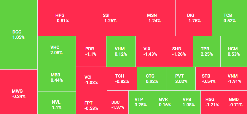 Các mã giảm chiếm áp đảo nên dù vẫn xuất hiện 5 cổ phiếu góp mặt trong Top 10 kéo tăng điểm thị trường như CTG, VPB, TPB, TCB, MBB nhưng nhóm này cũng không thoát khỏi phiên giảm điểm.