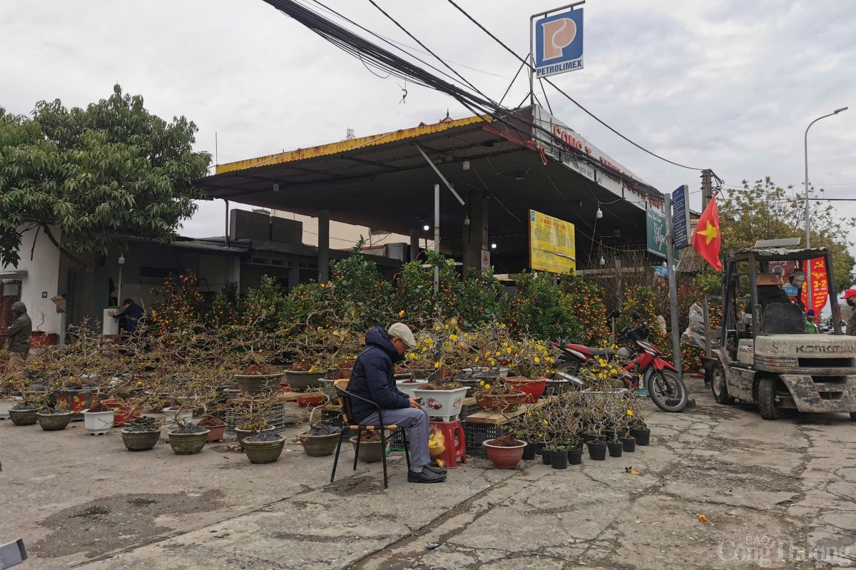 | Điểm bán cây tại cây xăng không còn hoạt động tại ngã tư Trạm Trôi, huyện Hoài Đức vẫn ken cứng các loại cây Tết. |