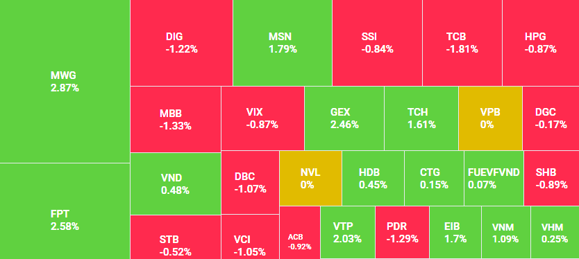 Trong nhóm cổ phiếu công nghệ, FPT tiếp tục kéo điểm tốt khi đứng đầu đà tăng và đóng góp gần 1 điểm vào thị trường. Đây là phiên thứ 2 liên tiếp nhóm công nghệ ghi nhận sự tích cực, các mã VGI, ITD, TEL, MFS, TIE cũng kết phiên trong sắc xanh.