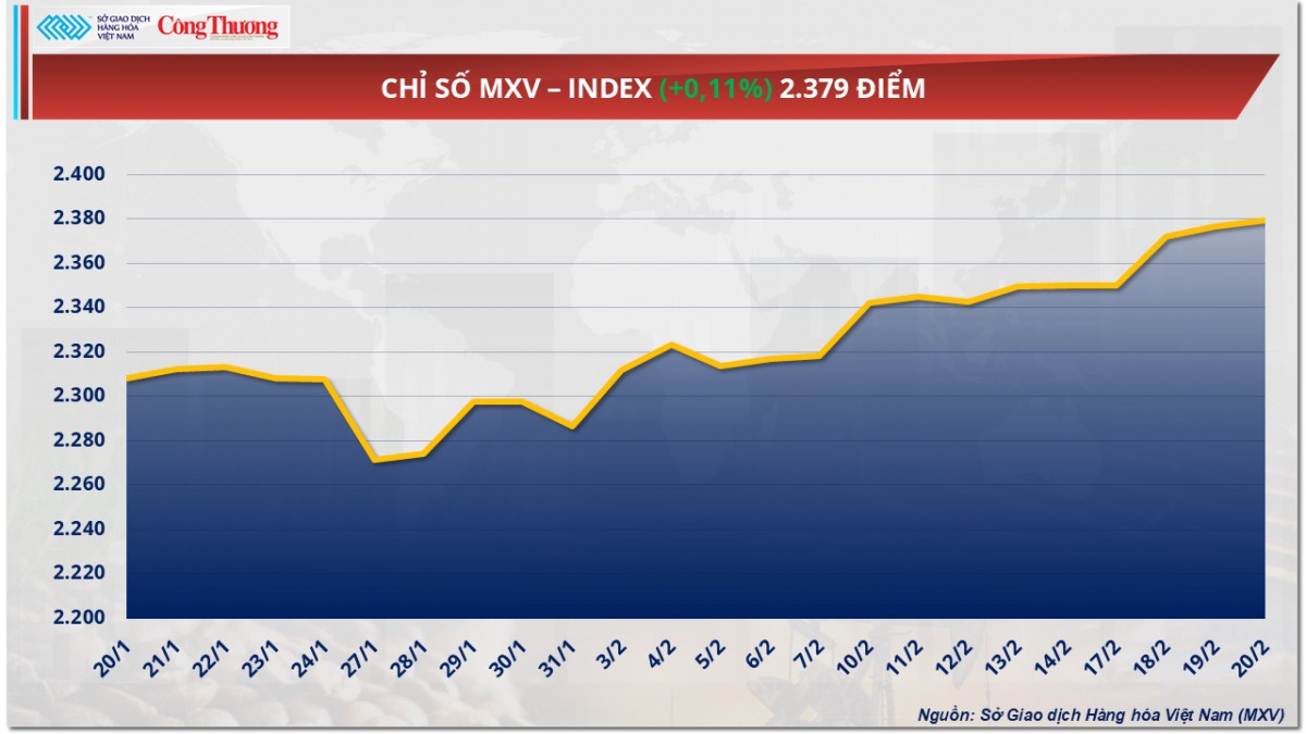 Theo Sở Giao dịch Hàng hóa Việt nam (MXV), thị trường hàng hóa nguyên liệu thế giới diễn biến phân hóa trong phiên giao dịch ngày hôm qua (20/2). Đáng chú ý, thị trường kim loại ghi nhận phiên giao dịch tích cực khi sắc xanh bao phủ hầu hết các mặt hàng trong nhóm. Ở chiều ngược lại, trên thị trường nguyên liệu công nghiệp, giá hai mặt hàng cà phê quay đầu giảm mạnh trước áp lực tồn kho phục hồi mạnh. Đóng cửa, lực mua chiếm ưu thế đã hỗ trợ chỉ số MXV-Index tăng 0,1% lên mức 2.379 điểm.