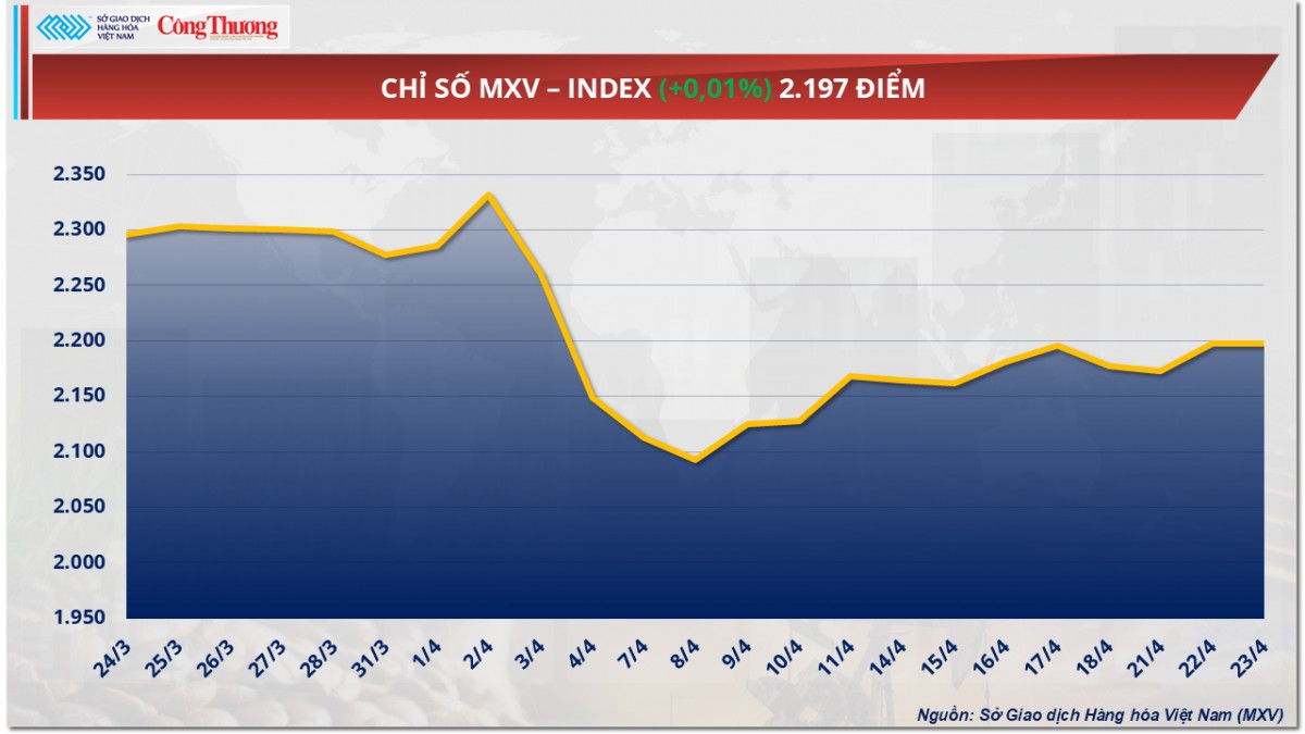 Sở Giao dịch Hàng hóa Việt Nam (MXV) cho biết thị trường tiếp tục xu hướng giằng co trong phiên giao dịch ngày hôm qua (23/4). Kết phiên, chỉ số MXV-Index đi ngang mức 2.197 điểm. Sắc đỏ bao phủ thị trường năng lượng, giá hai mặt hàng dầu thô bất ngờ quay đầu lao dốc. Ở chiều ngược lại, nhiều mặt hàng kim loại tăng giá nhờ tín hiệu tích từ thị trường.