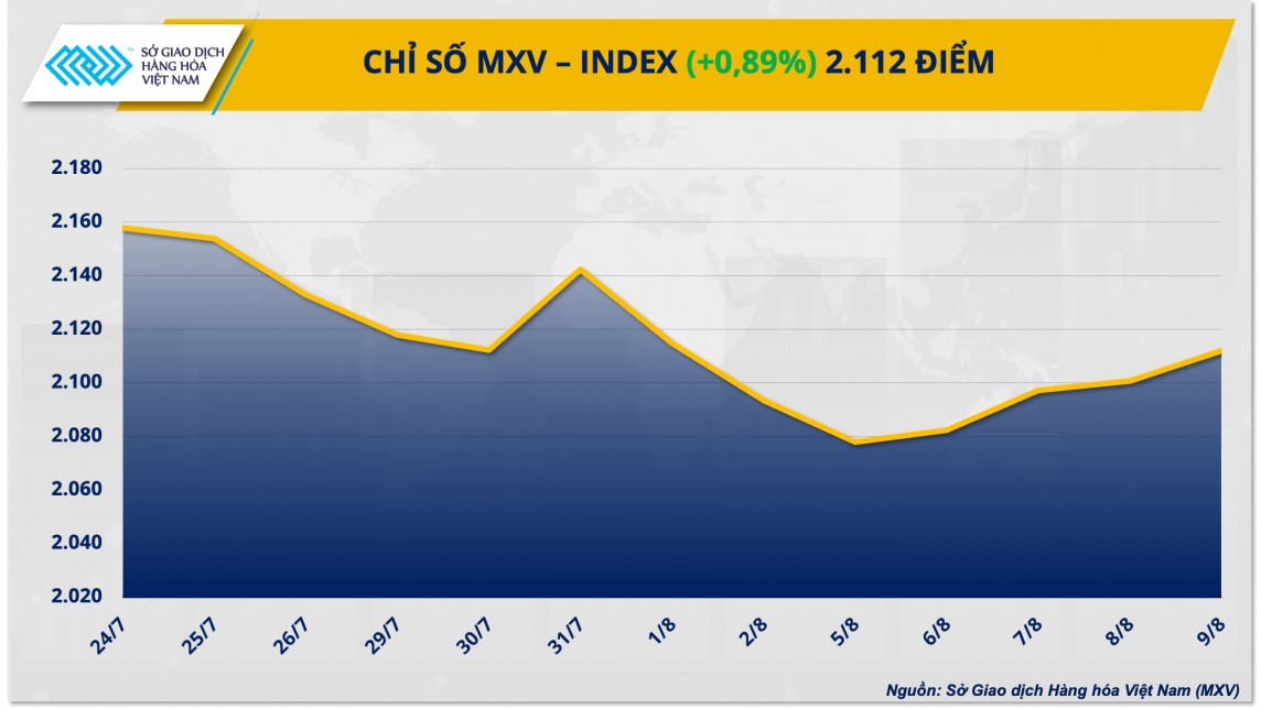 Đóng cửa, chỉ số MXV-Index tăng 0,89% lên 2.112 điểm sau bốn ngày đi lên liên tiếp. Đáng chú ý, thị trường năng lượng và nguyên liệu công nghiệp đã chứng kiến hàng hoạt mặt hàng giá bật tăng mạnh.