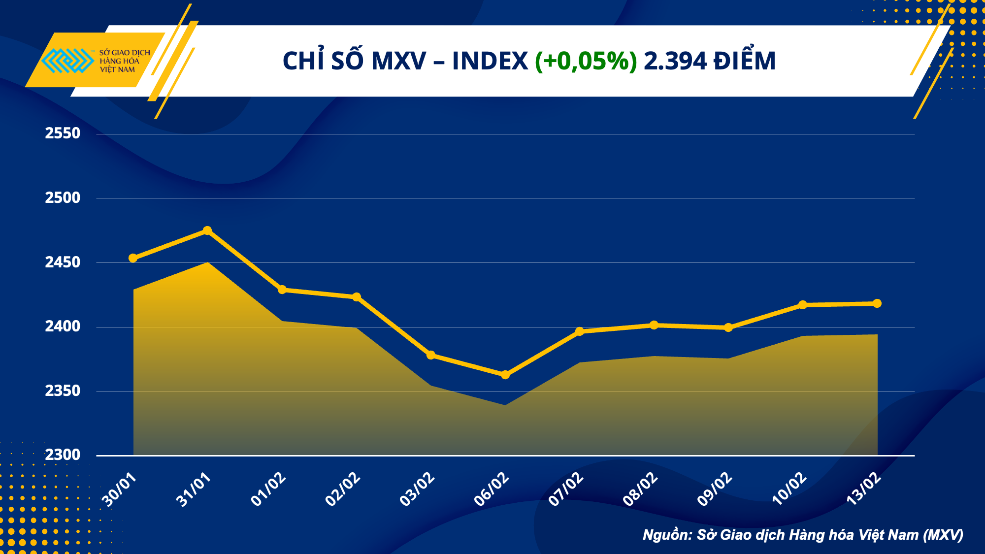 Theo Sở Giao dịch Hàng hoá Việt Nam, trên thị trường hàng hoá diễn biến tăng giảm trái chiều với biên độ tương đối hẹp của các mặt hàng được giao dịch liên thông quốc tế tại Sở Giao dịch Hàng hoá Việt Nam (MXV), khiến cho chỉ số MXV-Index chỉ tăng nhẹ 0,05% lên mức 2.394 điểm. Con số này vẫn cao hơn mức điểm trung bình của tuần trước.