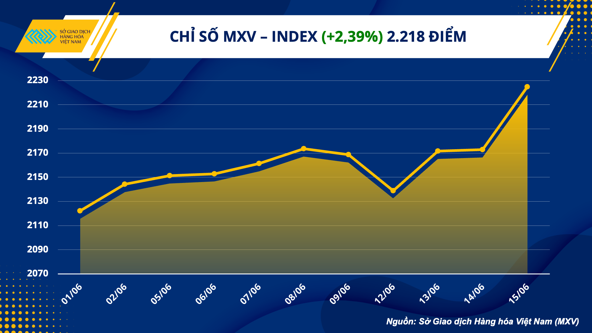 Số liệu từ Sở Giao dịch Hàng hóa Việt Nam (MXV) cho thấy, lực mua hoàn toàn áp đảo trên thị trường hàng hóa nguyên liệu trong ngày hôm qua (15/6). 26 trên tổng số 31 mặt hàng đang đượcgiao dịch liên thông thế giới tại MXV đồng loạt tăng giá, đã hỗ trợ chỉ số MXV- Index tăng mạnh 2,39% lên 2.218 điểm, nối dài đà tăng sang phiên thứ 3 liên tiếp.