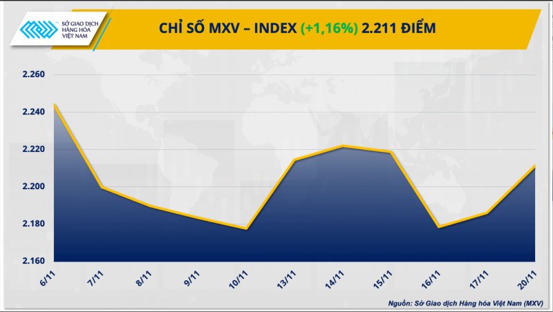 Sắc đỏ phủ kín bảng giá nông sản. Trong khi giá nhiều mặt hàng nhóm năng lượng và kim loại lại đi lên. Chỉ số MXV-Index rơi 0,37% xuống 2.150 điểm, chấm dứt chuỗi tăng 4 ngày liên tục. Giá trị giao dịch đạt trên 4.200 tỷ đồng.