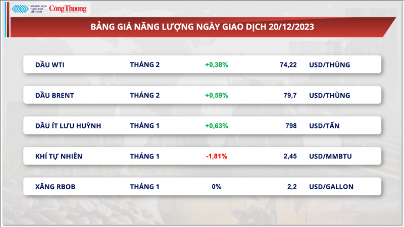 Kết thúc ngày giao dịch 20/12, giá dầu diễn biến giằng co và chốt phiên tăng nhẹ. Lo ngại gián đoạn thương mại toàn cầu tại biển Đỏ vẫn đang là chất xúc tác chính thúc đẩy lực mua. Ngoài ra, áp lực lạm phát tại các nền kinh tế lớn hạ nhiệt củng cố kịch bản lãi suất đã đạt đỉnh, cũng góp phần hỗ trợ giá.