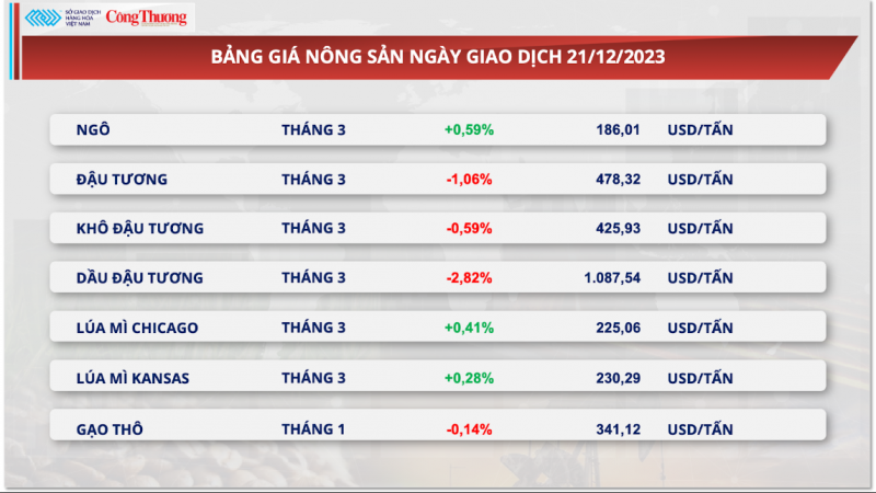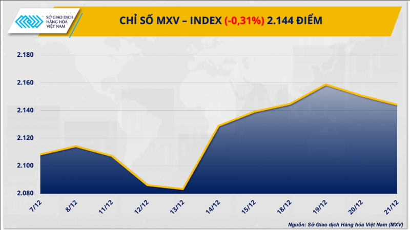Số liệu từ Sở Giao dịch Hàng hóa Việt Nam (MXV) cho thấy, lực bán hoàn toàn áp đảo trên thị trường hàng hóa trong phiên giao dịch ngày 21/12, kéo chỉ số MXV-Index giảm 0,31% xuống 2.144 điểm. Tuy nhiên, nhờ tính chất giao dịch hai chiều, giá trị giao dịch toàn Sở vẫn đạt hơn 5.800 tỷ đồng.