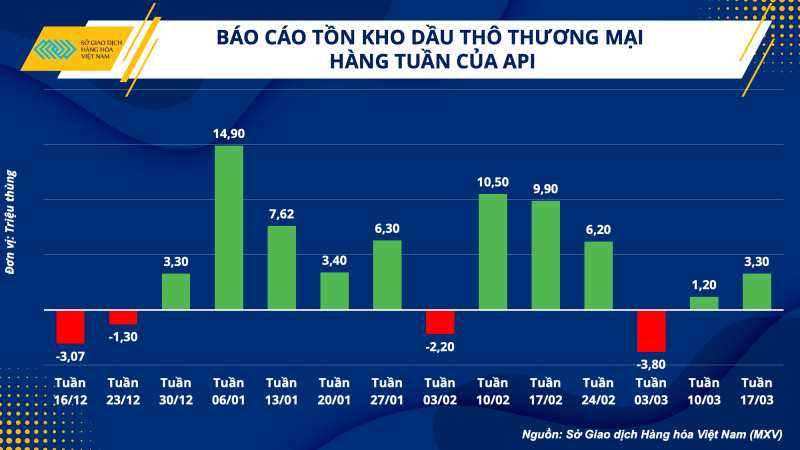 Rạng sáng nay theo giờ Việt Nam, báo cáo từ Viện dầu khí độc lập (API) cho thấy tồn kho dầu thô thương mại Mỹ tăng 3,3 triệu thùng trong tuần kết thúc ngày 17/03, và là tuần tăng thứ 2 liên tiếp, trái với dự đoán giảm của thị trường. Điều này có thể khiến giá dầu gặp áp lực nhẹ trong phiên sáng, tuy nhiên, tồn kho xăng và nhiên liệu chưng cất giảm, cùng các yếu tố cung cầu đang tương đối hỗ trợ, giá dầu có thể sớm tiếp tục đà phục hồi.
