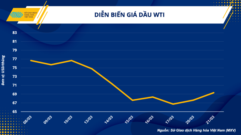 Theo Sở Giao dịch hàng hoá Việt Nam (MXV), giá dầu tiếp tục phiên phục hồi thứ 2 liên tiếp khi việc giải cứu Credit Suisse làm dịu bớt lo ngại về một cuộc khủng hoảng ngân hàng sẽ ảnh hưởng đến tăng trưởng kinh tế và làm giảm nhu cầu tiêu thụ nhiên liệu. Trong khi đó, gián đoạn trong việc sản xuất dầu tại nhà máy Pháp vẫn đang tiếp diễn do đình công, cũng đã thúc đẩy đà tăng của giá. Kết thúc phiên giao dịch ngày 21/03, giá dầu WTI tăng 2,73% lên sát ngưỡng 70 USD/thùng, dầu Brent tăng 2,07% lên 75,32 USD/thùng.