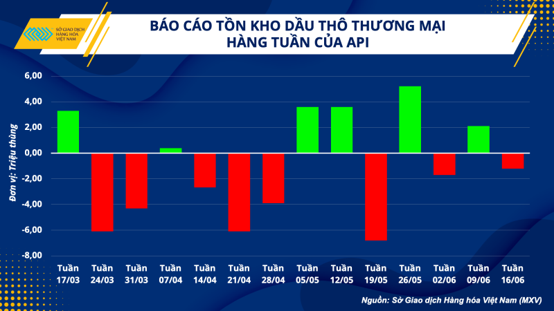 Rạng sáng nay theo giờ Việt Nam, báo cáo của Viện dầu khí độc lập (API) cho thấy tồn kho dầu thương mại của Mỹ giảm 1,2 triệu thùng trong tuần kết thúc ngày 16/06, trái ngược với dự đoán tăng của thị trường, đã củng cố thêm cho đà phục hồi của giá dầu.