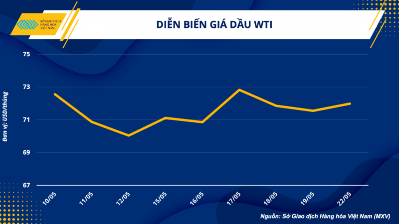 Theo Sở Giao dịch hàng hoá Việt Nam (MXV), thị trường dầu thô lấy lại sắc xanh trong phiên giao dịch đầu tuần, chấm dứt chuỗi giảm bốn phiên liên tiếp. Kết thúc phiên 22/05, giá dầu thô WTI tăng nhẹ 0,50% lên 72,05 USD/thùng, giá dầu thô Brent tăng 0,53% lên 75,87 USD/thùng.