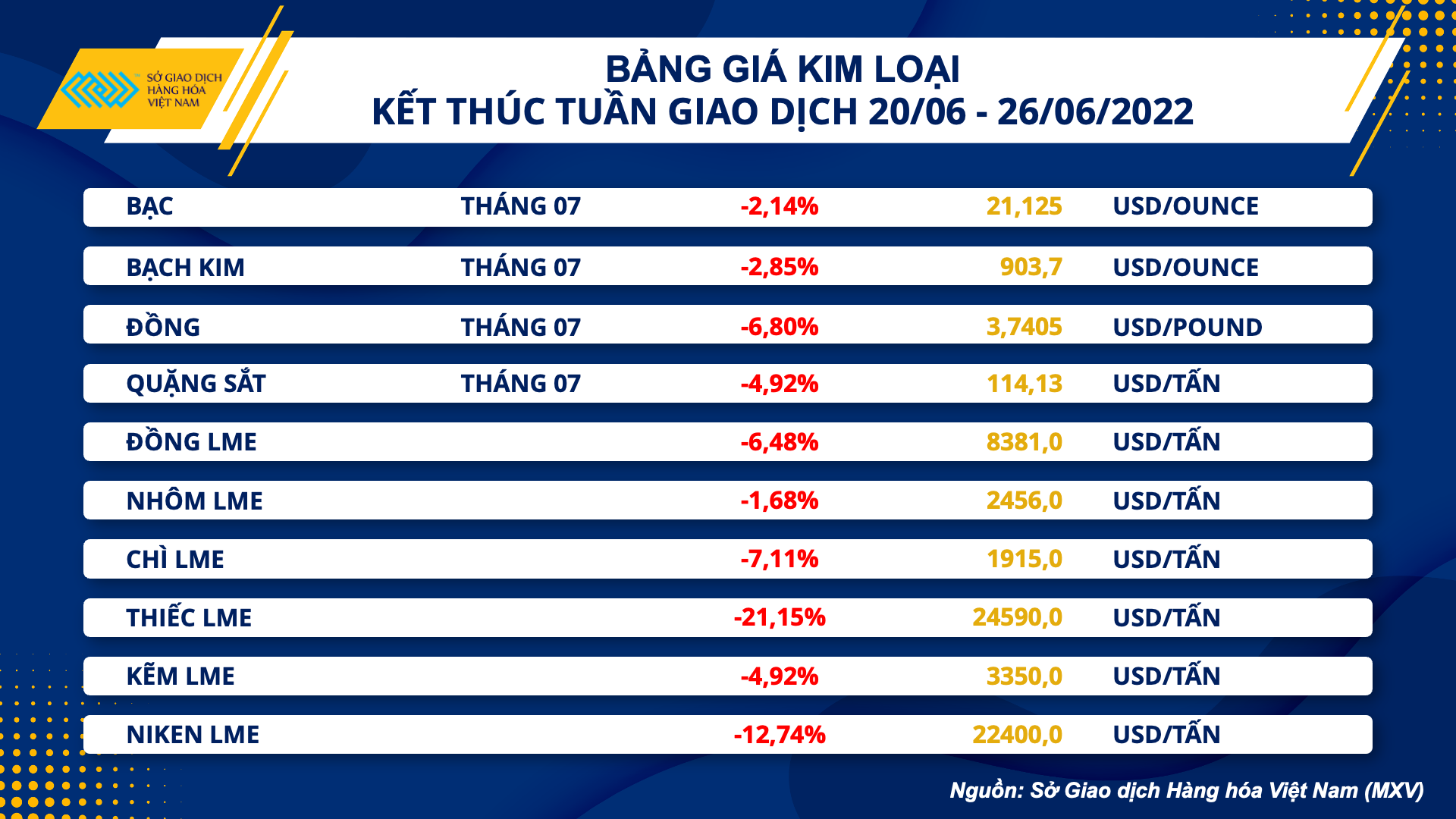 Đối với nhóm kim loại, các mặt hàng đã trải qua một tuần tồi tệ khi khi đồng loạt lao dốc trước lo ngại về suy thoái kinh tế rình rập trong tương lai. Nhóm kim loại quý vẫn cho thấy sự hoạt động yếu kém trước mối lo nền kinh tế tăng trưởng chậm lại sẽ ngăn cản nhu cầu sử dụng bạc và bạch kim trong hoạt động sản xuất công nghiệp. Đồng Đô la duy trì quanh mức cao nhất trong vòng 2 thập kỷ và mạnh hơn các đồng tiền thương mại khác, tiếp tục làm suy yếu vai trò trú ẩn của bạc và bạch kim.