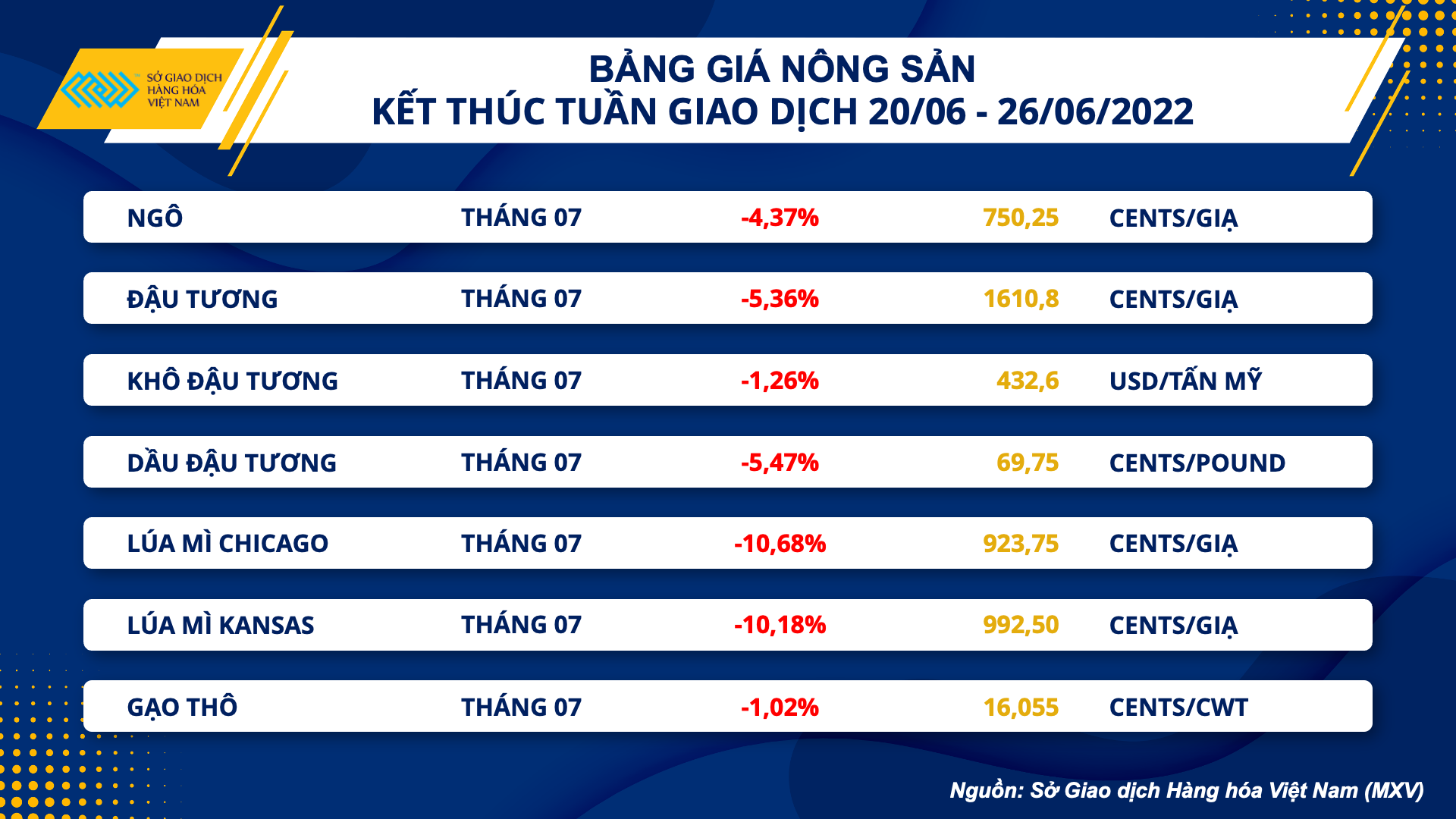 Theo Sở Giao dịch Hàng hóa Việt Nam (MXV), chỉ số MXV-Index của toàn bộ 4 nhóm nguyên liệu lao dốc và do đó, kéo theo chỉ số MXV-Index chung của toàn sở có tuần giảm thứ 2 liên tiếp sau khi đánh mất 4,67% xuống mức 2775.91 điểm. Giá trị giao dịch suy yếu gần 23% so với tuần trước đó, chủ yếu do một số mặt hàng nghỉ giao dịch trong phiên đầu tuần.