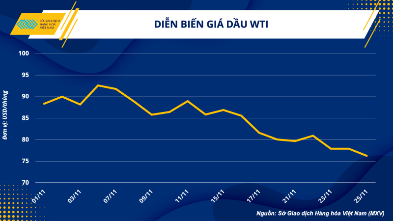 Theo Sở giao dịch hàng hóa Việt Nam (MXV), giá dầu thô nối dài đà giảm sáng tuần thứ 3 liên tiếp và ghi nhận mức đóng cửa tuần thấp nhất kể từ đầu năm cho đến nay. Bức tranh tiêu thụ tiêu cực, trong khi những lo ngại về nguồn cung trong ngắn hạn tạm thời giảm bớt đã gây áp lực lên giá. Kết thúc tuần giao dịch 21/11 – 27/11, giá dầu WTI kỳ hạn tháng 1 năm sau trên sở NYMEX giảm 4,78% xuống còn 76,28 USD/thùng, trong khi Brent cùng kỳ hạn trên sở ICE giảm 3,8% xuống 83,84 USD/thùng.