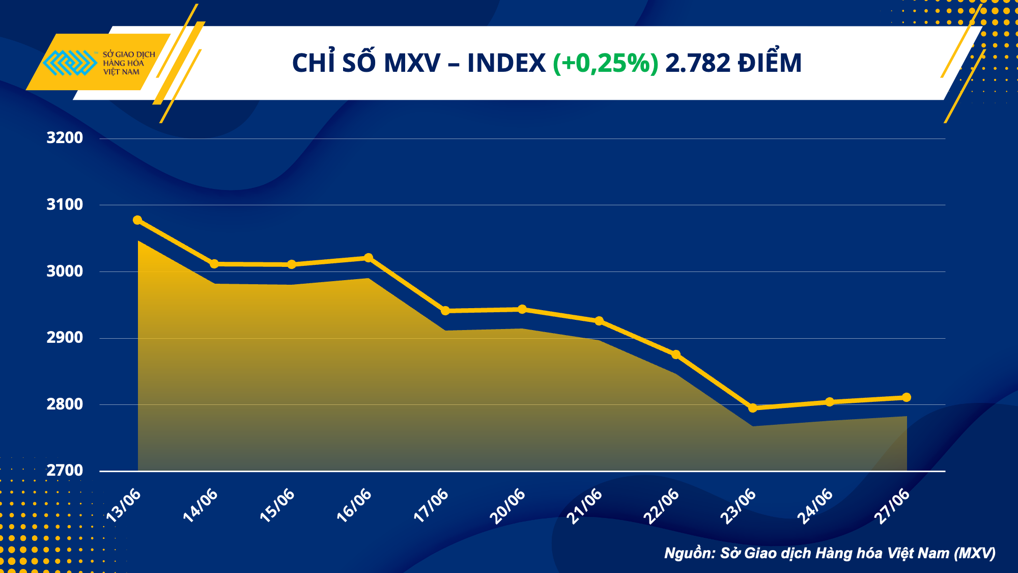 Theo Sở Giao dịch hàng hóa Việt Nam (MXV), diễn biến phân hoá trên khiến chỉ số MXV-Index chỉ tăng nhẹ 0,25% lên mức 2.782 điểm. Giá trị giao dịch toàn Sở có sự sụt giảm, đạt hơn 3.800 tỷ đồng.