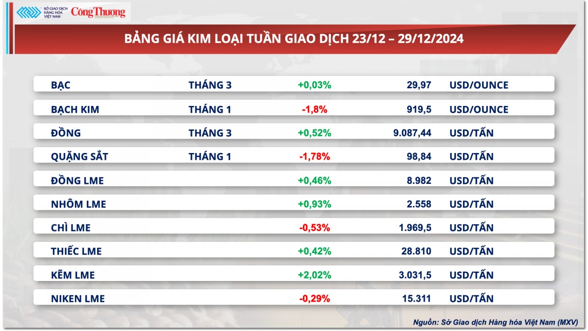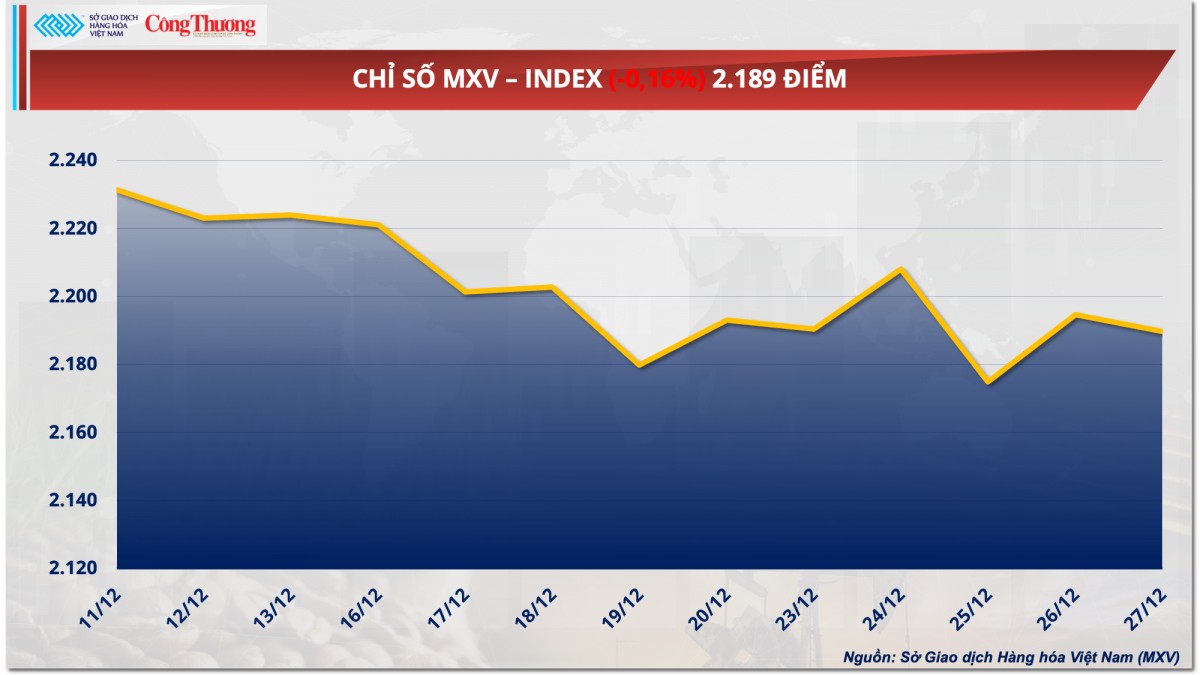 Theo Sở Giao dịch hàng hóa Việt Nam (MXV), lực bán chiếm ưu thế trên thị trường hàng hóa nguyên liệu thế giới trong tuần qua (23 - 29/12), kéo chỉ số MXV-Index giảm nhẹ 0,16% xuống 2.189 điểm. Đáng chú ý, trên thị trường nguyên liệu công nghiệp, giá ca cao sụt lao dốc rất mạnh, hơn 15% xuống mức thấp nhất trong gần ba tuần trở lại đây. Trong khi đó, trên thị trường kim loại, giá nhiều mặt hàng lại tăng giá tích cực trong tuần có nghỉ lễ Giáng sinh.