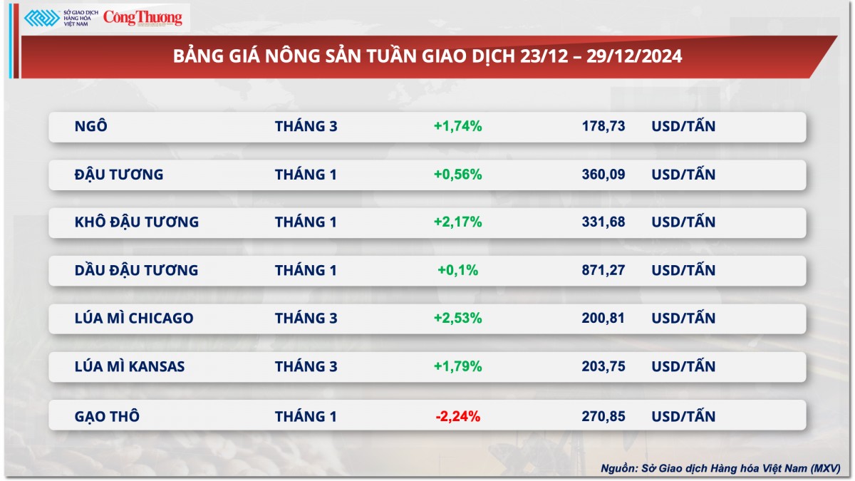 Bên cạnh đó, nhu cầu của thị trường nhìn chung vẫn tích cực. Trong báo cáo Export Inspections, Bộ Nông nghiệp Mỹ (USDA) cho biết nước này đã giao 1,75 triệu tấn đậu tương trong tuần kết thúc ngày 19/12, tăng so với mức 1,69 triệu tấn trong tuần trước và mức 1,12 triệu tấn cùng kỳ năm ngoái. Ngoài ra, trong báo cáo Daily Export Sales ngày 13/12, USDA cũng cho biết Mỹ đã bán được đơn hàng 132.000 tấn đậu tương giao trong niên vụ 2024-2025 cho Trung Quốc. Điều này cho thấy hoạt động xuất khẩu của Mỹ đã có sự cải thiện trong tuần qua, thúc đẩy lực mua trên thị trường.