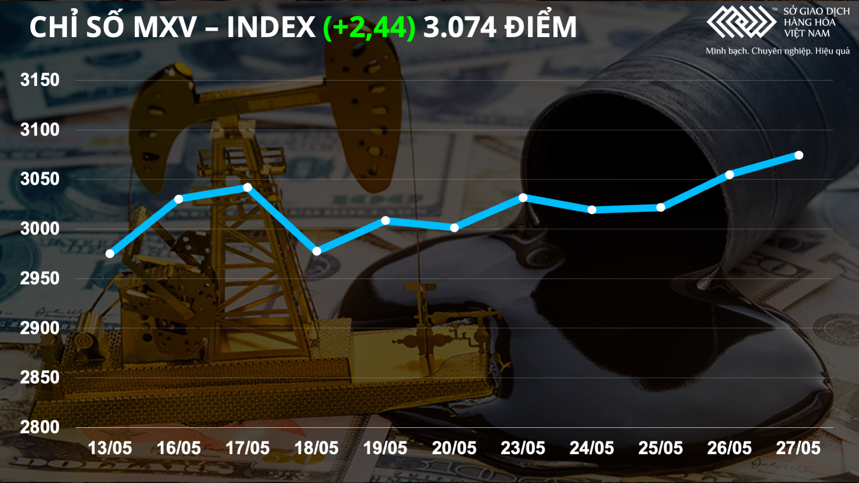 Thị trường hàng hóa đang có sắc xanh vượt trội trên bảng giá 31 mặt hàng đang liên thông trực tiếp với thế giới tại MXV, giúp cho chỉ số MXV-Index tăng mạnh 2,44% lên mức 3.074,59 điểm, cao nhất kể từ giữa tháng Tư đến nay.