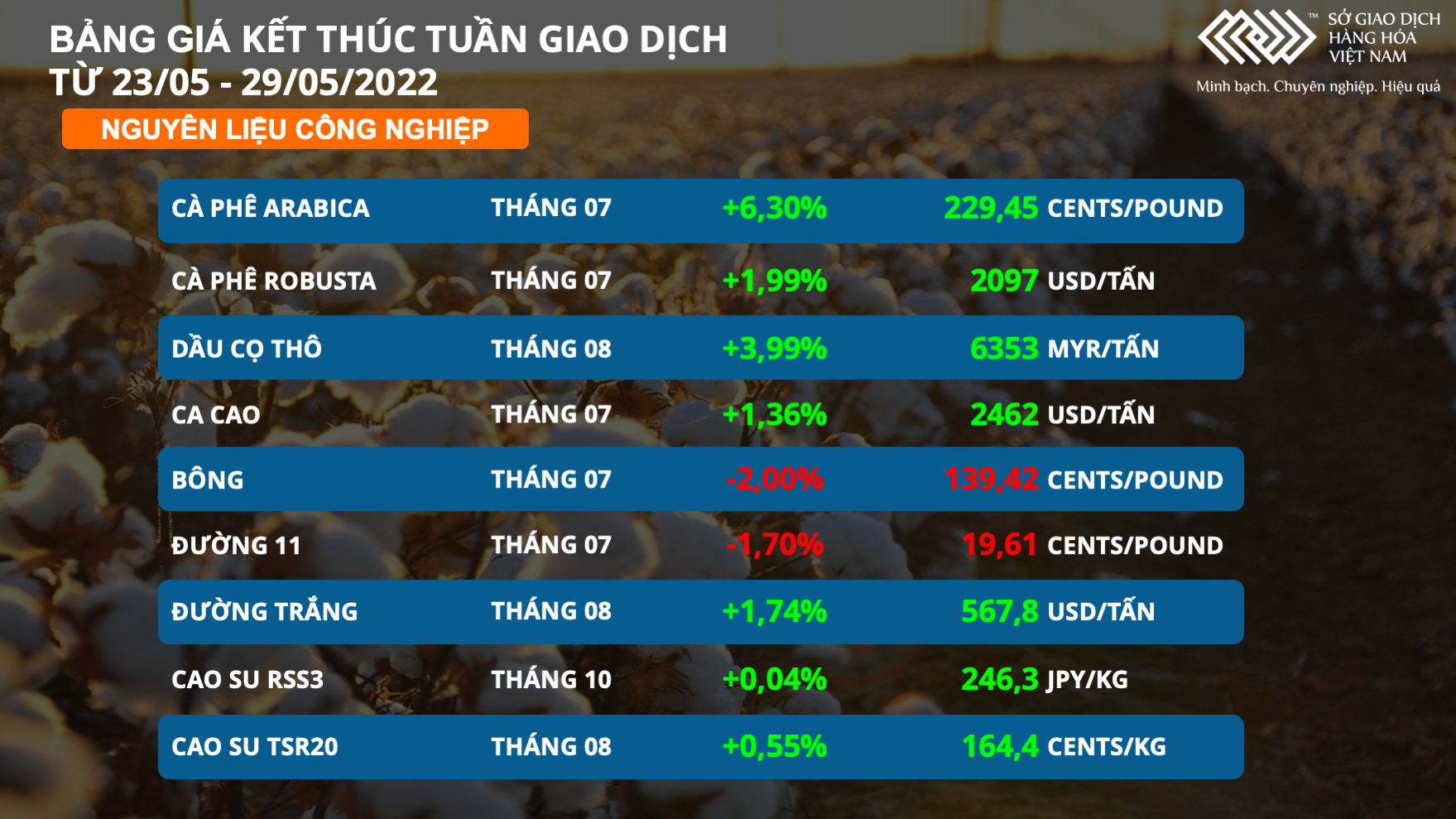 Theo sau mức tăng mạnh của nhóm năng lượng là nhóm nguyên liệu công nghiệp. Chỉ số MXV-Index Công nghiệp phục hồi hơn 2%, sau khi bị đẩy về mức thấp nhất 1 tháng trong tuần trước đó. Dẫn đầu toàn nhóm là mức tăng rất mạnh hơn 6% của giá cà phê Arabica.