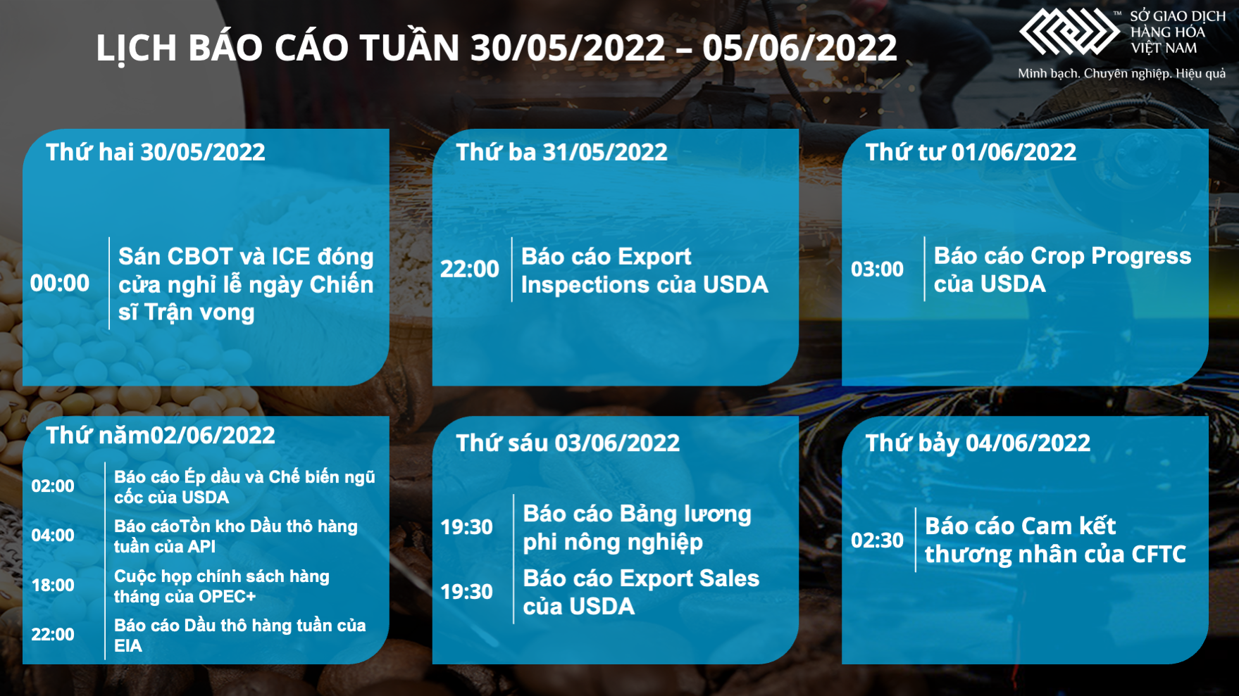 Trong đầu tuần này, các mặt hàng nông sản và nguyên liệu công nghiệp trên các Sở của Mỹ sẽ đóng cửa phiên thứ Hai, do nghỉ Lễ Chiến sĩ trận vong. Đối với các mặt hàng thuộc nhóm kim loại và năng lượng, thị trường cũng sẽ đóng cửa sớm hơn thường lệ. Hoạt động giao dịch tại các Sở sẽ trở lại bình thường vào thứ Ba (31/05).