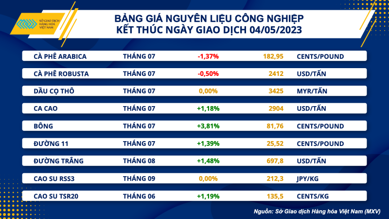 Kết thúc phiên giao dịch ngày 04/05, sắc xanh áp đảo trên bảng giá các mặt hàng nhóm nguyên liệu công nghiệp. Đáng chú ý khi giá bông tăng kịch trần nhờ dữ liệu bán hàng, xuất khẩu tích cực tại Mỹ.