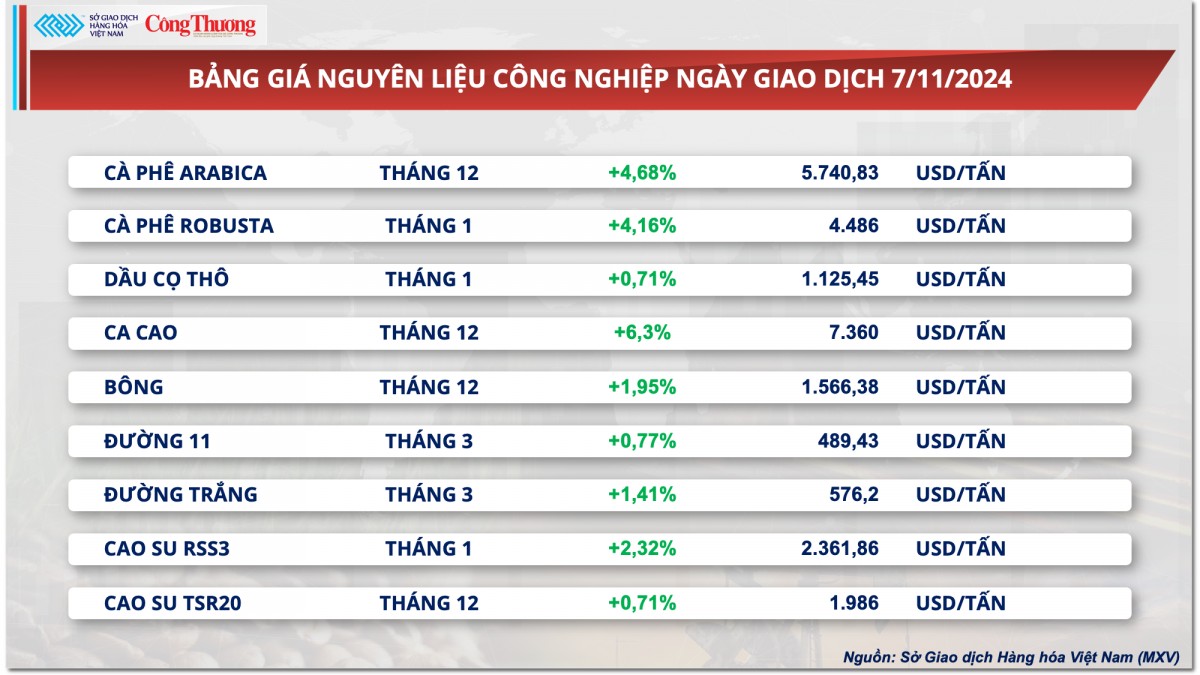Sở Giao dịch Hàng hóa Việt Nam (MXV), cho biết sắc xanh bao phủ thị trường hàng hóa nguyên liệu trong ngày hôm qua (7/11) kéo chỉ số MXV-Index tăng 1,69% lên 2.208 điểm – mức cao nhất trong ba tuần trở lại đây. Đáng chú ý, toàn bộ 9 mặt hàng nhóm nguyên liệu công nghiệp đều đồng loạt tăng giá, trong đó dẫn đầu là ca cao bứt phá 6,3%, cà phê Arabica và Robusta đồng loạt tăng hơn 4%.