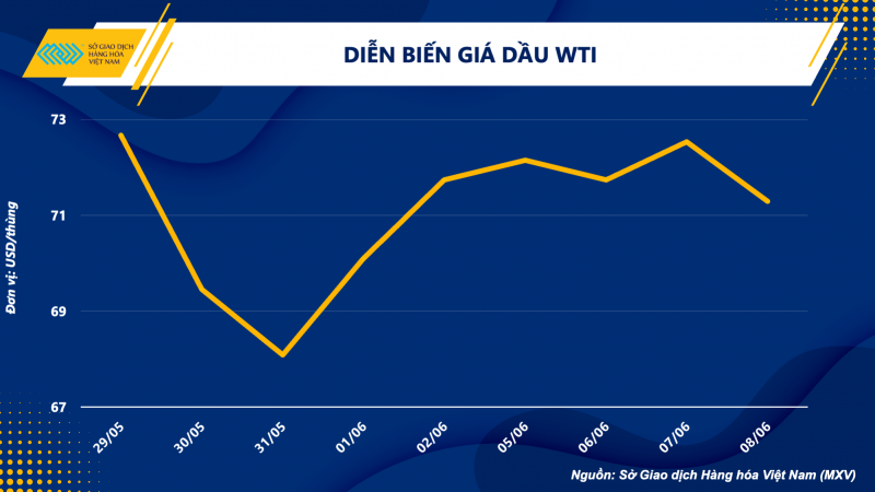 Theo Sở Giao dịch hàng hoá Việt Nam (MXV), giá dầu ghi nhận phiên giao dịch ngày 08/06 đầy biến động, với dầu WTI đã có thời điểm rơi xuống sát mốc 69 USD/thùng trước khi lấy lại đà phục hồi. Kết phiên, đà giảm của giá dầu được thu hẹp một phần, với dầu WTI đóng cửa ở mức 71,29 USD/thùng, giảm 1,71% so với mốc tham chiếu. Giá dầu Brent giảm 1,29% xuống 75,96 USD/thùng.