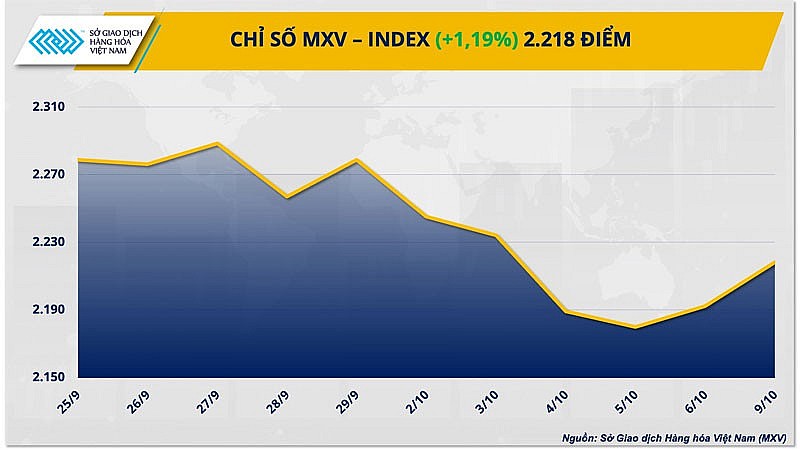 Số liệu từ Sở Giao dịch Hàng hóa Việt Nam (MXV) cho thấy, đóng cửa ngày giao dịch đầu tuần (9/10), lực mua hoàn toàn áp đảo trên thị trường hàng hóa nguyên liệu thế giới đã hỗ trợ chỉ số MXV-Index tăng ngày thứ hai liên tiếp, với mức tăng tương đối mạnh 1,19% lên 2.218 điểm. Phải sau nửa tháng, chỉ số hàng hoá này mới ghi nhận có hai ngày tăng giá liên tiếp. Giá trị giao dịch toàn Sở cũng tăng nhẹ, đạt mức 3.400 tỷ đồng.