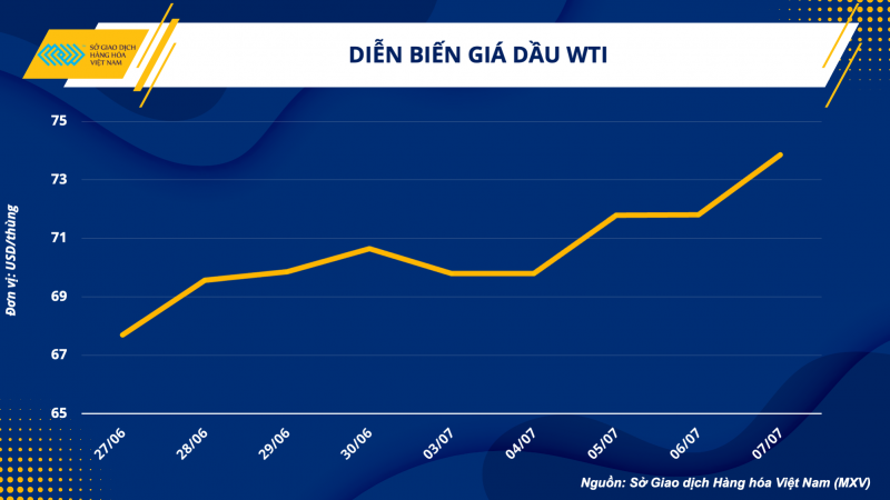 Theo Sở Giao dịch hàng hoá Việt Nam (MXV), thị trường hàng hoá hôm nay diễn biến như sau, kết thúc tuần giao dịch ngày 03/07 – 09/07, dầu thô ghi nhận tuần tăng giá thứ 2 liên tiếp, lên mức cao nhất trong vòng một tháng qua. Cụ thể, giá dầu WTI tăng 4,56% lên 73,86 USD/thùng và giá dầu Brent chốt tuần tại mức giá 78,47 USD/thùng, cao hơn 4,06% so với tuần trước đó.