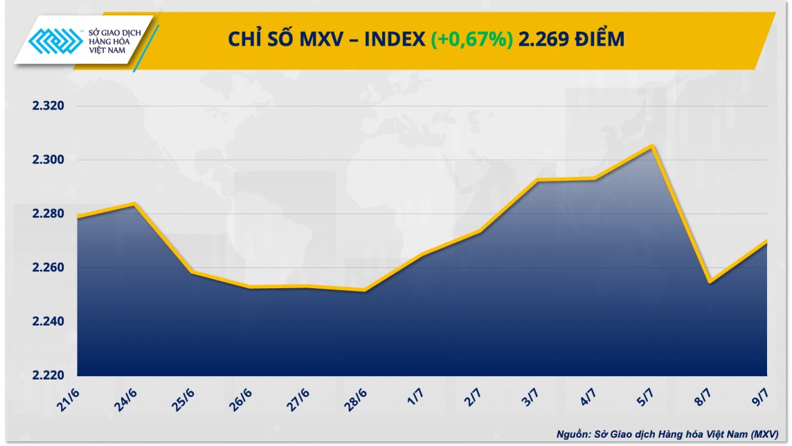 Trong đó, đà tăng mạnh của các mặt hàng trong nhóm nguyên liệu công nghiệp đã dẫn dắt xu hướng chung của toàn thị trường. Chỉ số MXV-Index phục hồi 0,67% lên 2.269 điểm.