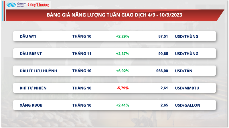 Kết thúc tuần giao dịch 4 - 11/9, có 4 trên 5 mặt hàng nhóm năng lượng đóng cửa trong sắc xanh. Trong đó, giá dầu tiếp nối đà tăng giá trong bối cảnh hạn chế nguồn cung từ các nước xuất khẩu dầu hàng đầu thế giới.