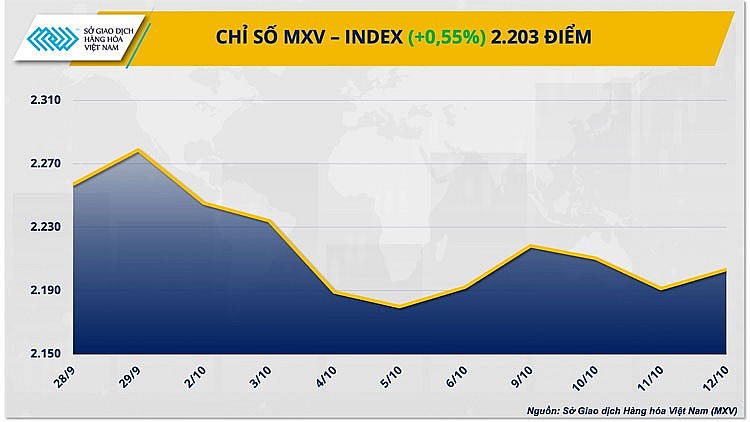 Số liệu từ Sở Giao dịch Hàng hóa Việt Nam (MXV) cho thấy, thị trường hàng hóa nguyên liệu hôm qua (12/10) đóng cửa với diễn biến phân hóa. Lực mua áp đảo trên nhóm nông sản và nguyên liệu công nghiệp. Trong khi đó, sắc đỏ chiếm ưu thế trên bảng giá kim loại và năng lượng. Tuy nhiên, đà tăng mạnh của nhiều mặt hàng đã hỗ trợ chỉ số MXV-Index chốt ngày đảo chiều tăng 0,55% lên 2.203 điểm. Đáng chú ý, dòng tiền mạnh mẽ quay lại thị trường, với mức tăng hơn 46%, đạt mức gần 3.900 tỷ đồng.