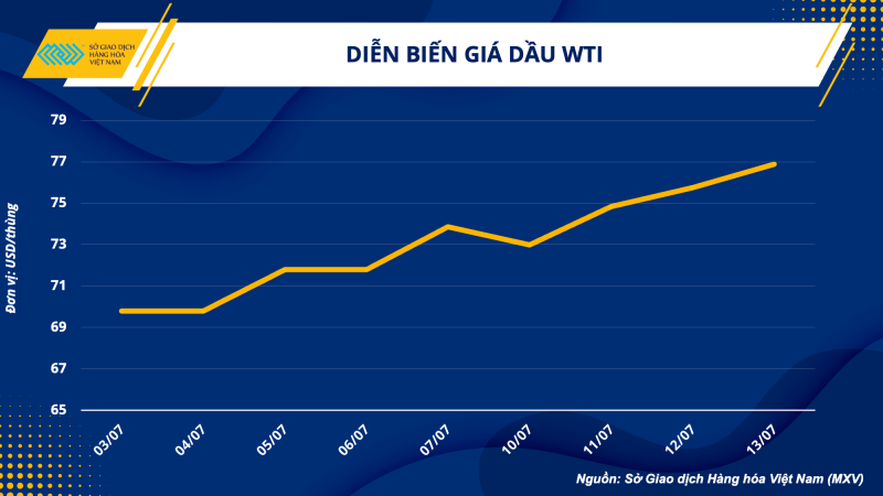 Theo Sở Giao dịch hàng hoá Việt Nam (MXV), thị trường hàng hoá hôm nay ngày 14/7/2023 diễn biến như sau: Kết thúc phiên giao dịch ngày 13/07, dầu thô ghi nhận ngày tăng giá ngày thứ 3 liên tiếp, đưa giá dầu lên mức cao nhất kể từ ngày 25/4. Cụ thể, trong phiên ngày hôm qua, giá dầu WTI tăng 1,5% lên 76,89 USD/thùng và dầu Brent chốt phiên tại mức giá 81,36 USD/thùng, cao hơn 1,56% so với phiên trước đó. Trong đó, cả yếu tố cung cầu và vĩ mô đồng loạt thúc đẩy lực mua trên thị trường.