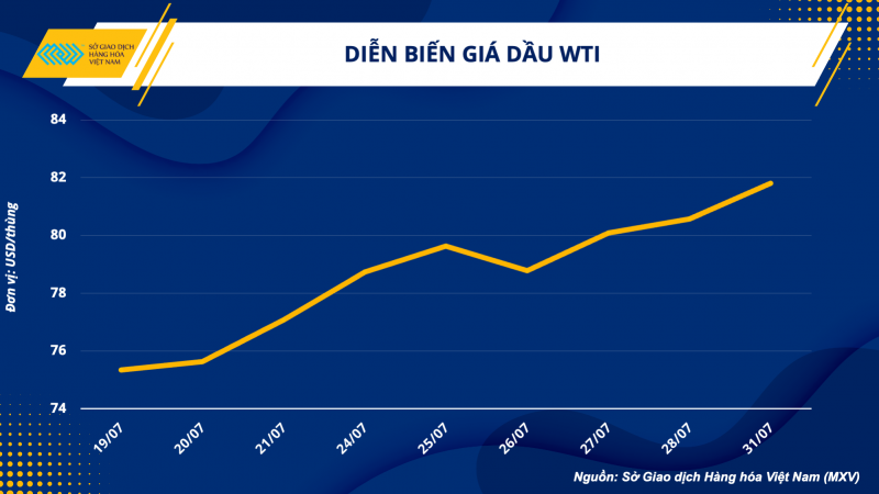 | Thị trường hàng hoá hôm nay ngày 29/7/2023 và nhìn lại tuần qua: Giá dầu đạt mốc 80 USDThị trường hàng hoá hôm nay 31/7/2023: Giá dầu WTI đạt 80,58 USD/thùng; Giá kim loại quý giảm |