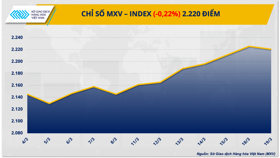 Trong đó, nhiều mặt hàng nhóm nguyên liệu và kim loại đồng loạt giảm giá kéo chỉ số MXV-Index rơi nhẹ 0,22% xuống 2.220 điểm. Giá trị giao dịch đạt trên 5.200 tỷ đồng.