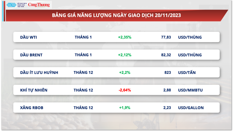 Kết thúc ngày giao dịch đầu tuần 20/11, giá dầu tăng hơn 2% nhờ kỳ vọng Tổ chức Các nước Xuất khẩu Dầu mỏ và đồng minh (OPEC+) cắt giảm thêm sản lượng trong cuộc họp ngày 26/11. Cụ thể, giá dầu WTI tăng 2,35% lên 77,83 USD. Dầu Brent chốt ngày tại 82,32 USD/thùng, tăng 2,12% so với phiên trước.