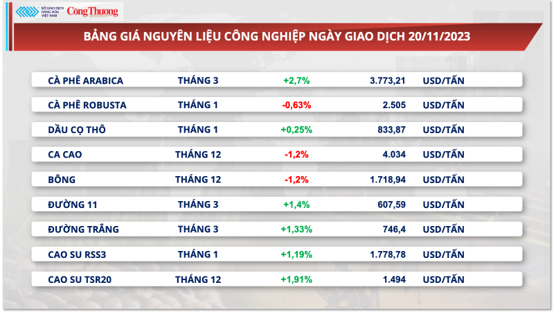 Số liệu từ Sở Giao dịch Hàng hóa Việt Nam (MXV) cho thấy, lực mua hoàn toàn áp đảo trên thị trường hàng hóa nguyên liệu thế giới trong ngày giao dịch đầu tuần, hỗ trợ chỉ số MXV-Index chốt ngày 20/11 tăng mạnh 1,16% lên 2.211 điểm. Giá trị giao dịch toàn Sở cũng ghi nhận mức tăng gần 7% so với ngày trước đó, đạt trên 3.900 tỷ đồng. Trong đó, dòng tiền vẫn tập trung chủ yếu ở nhóm nông sản, chiếm đến 38% tổng khối lượng giao dịch của toàn thị trường.