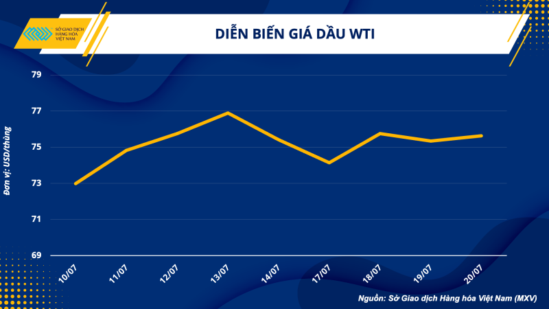 Thống kê của Sở Giao dịch hàng hoá Việt Nam (MXV), thị trường hàng hoá hôm nay ngày 21/7/2023 diễn biến như sau: Dầu thô ghi nhận một phiên biến động giằng co trong phiên giao dịch ngày 20/07, trước khi đóng cửa phiên với mức tăng nhẹ, khi thanh khoản trong ngày ở mức thấp nhất 6 tháng qua. Cụ thể, giá dầu WTI tăng 0,48% lên mức 75,65 USD/thùng. Dầu Brent chốt phiên với mức giá 79,62 USD/thùng, tăng 0,2% so với phiên trước đó.