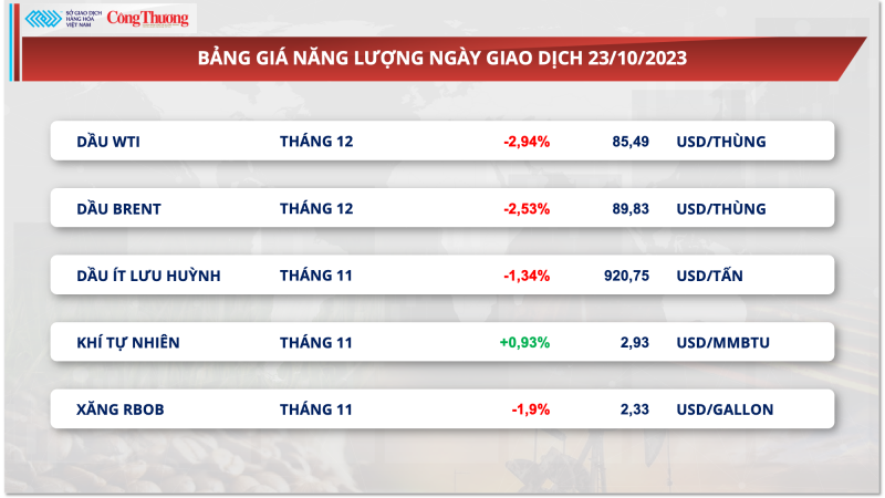Chốt ngày giao dịch 23/10, giá dầu giảm mạnh trong bối cảnh nhà lãnh đạo của các quốc gia liên quan nỗ lực ngoại giao ở Trung Đông, nhằm ngăn chặn xung đột Israel - Hamas. MXV cho biết, điều này làm giảm bớt lo ngại của nhà đầu tư về khả năng gián đoạn nguồn cung dầu trong khu vực. Cụ thể, giá dầu WTI giảm 2,94% xuống 85,49 USD/thùng. Trong khi đó, giá dầu Brent giảm 2,53% xuống 89,83 USD/thùng.