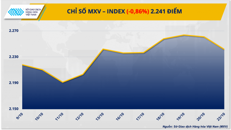 Số liệu từ Sở Giao dịch Hàng hóa Việt Nam (MXV) cho thấy, lực bán áp đảo trên thị trường hàng hóa nguyên liệu thế giới trong ngày hôm qua (23/10), kéo chỉ số MXV-Index chốt ngày giảm 0,86% xuống 2.241 điểm. Trong đó, 4 trên 5 mặt hàng ghi nhận các mức giảm giá mạnh. Nhóm năng lượng đóng vai trò quan trọng trong đà suy yếu chung của toàn thị trường. Bên cạnh đó, giá trị giao dịch toàn Sở cũng cho thấy tín hiệu sụt giảm, đạt gần 4.000 tỷ đồng.