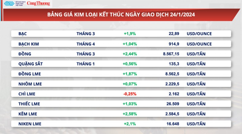 | Thị trường hàng hóa hôm nay ngày 23/1/2024: Dòng tiền đầu tư đạt mức cao kỷ lục từ đầu nămThị trường hàng hóa hôm nay ngày 24/1: Nhóm kim loại đồng loạt tăng giá,giá dầu tiếp tục diễn biến giằng co |