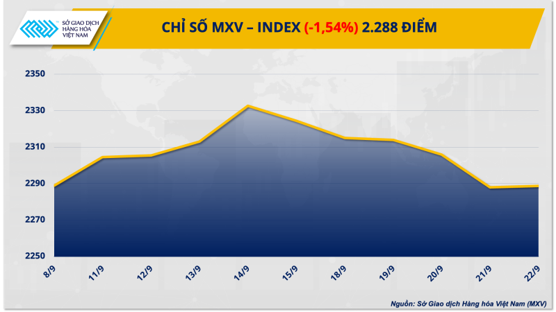 Dữ liệu từ Sở Giao dịch Hàng hóa Việt Nam (MXV) cho thấy, thị trường hàng hóa đảo chiều giảm mạnh trong tuần vừa qua khi chỉ có 9 mặt hàng giữ được sắc xanh. Với 22 mặt hàng giảm giá, chỉ số MXV-Index chốt tuần giảm 1,5% xuống còn 2.288 điểm. Nông sản và nguyên liệu công nghiệp là hai nhóm chịu sức ép bán mạnh nhất trong tuần với nhiều mặt hàng ghi nhận các mức giảm sâu đã đóng góp vào đà suy yếu của toàn thị trường.