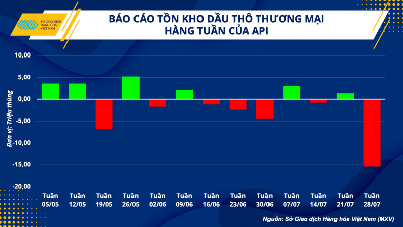 Nhìn chung, giá dầu giảm một phần do lực bán chốt lời, trong khi lo ngại về việc thâm hụt vẫn là nhân tố chính hỗ trợ giá. Rạng sáng nay theo giờ Việt Nam, Viện dầu khí Mỹ (API) cho biết tồn kho dầu thô thương mại Mỹ bất ngờ giảm mạnh 15,4 triệu thùng trong tuần kết thúc ngày 28/07, cho thấy nhu cầu gia tăng. Giá dầu ngay lập tức tăng mạnh sau báo cáo.