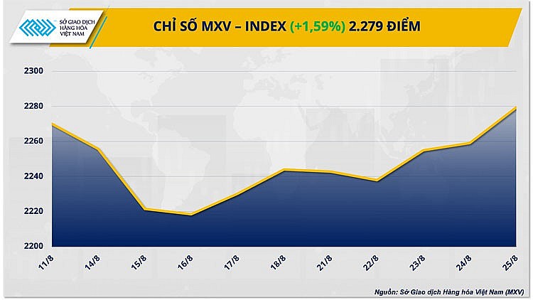 Số liệu từ Sở Giao dịch Hàng hóa Việt Nam (MXV) cho thấy lực mua hoàn toàn áp đảo trên cả 4 nhóm mặt hàng đang được giao dịch liên thông thế giới tại MXV. Điều này hỗ trợ chỉ số MXV-Index đóng cửa tuần qua bật tăng 1,59% lên 2.279 điểm, chấm dứt chuỗi giảm 3 tuần liên tiếp. Đáng chú ý, dòng tiền đầu tư trở lại thị trường, thể hiện qua giá trị giao dịch trung bình đạt mức trên 4.300 tỷ đồng mỗi phiên, tăng hơn 34% so với tuần trước đó.