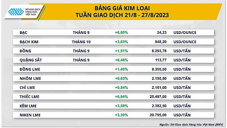 Đóng cửa tuần giao dịch 21/8 – 27/8, tất cả các mặt hàng nhóm kim loại đồng loạt tăng giá. Đối với nhóm kim loại quý, giá bạc và bạch kim đứt chuỗi giảm 5 tuần liên tiếp, trong khi giá vàng lấy lại mốc 1.900 USD/ounce, chấm dứt chuỗi giảm 4 tuần liên tiếp. Cụ thể, giá bạc bứt phá 6,6% lên 24,23 USD/ounce, giá bạch kim tăng 3,63%, đóng cửa tuần tại mức 948,3 USD/ounce. Giá vàng lên mức 1.914,5 USD/ounce sau khi tăng 1,39%.
